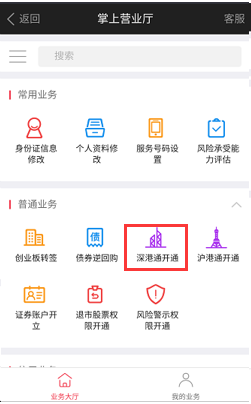 登录手机交易软件“财富乐赚”,选择“我的”—业务办理—点击“深港通开通”—点击“开通” — 投资者教育—知识测评—手机验证--协议签署,完成申请。下载 “财富乐赚” 的链接地址: /main/include/software.html
